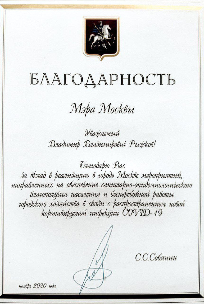 Благодарность от мэра Москвы, Сергея Семёновича Собянина, за вклад в реализацию в Москве мероприятий, направленных на обеспечение санитарно-эпидемиологического благополучия населения и бесперебойной работы городского хозяйства.